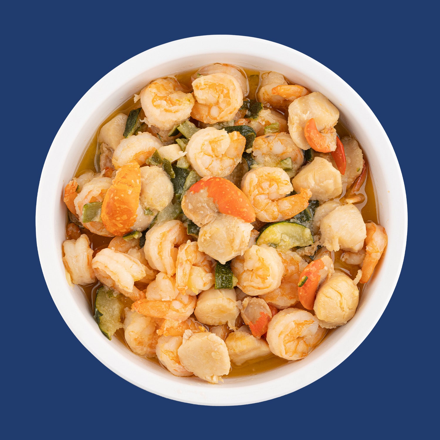 Capesante, code di mazzancolla, zucchine, olio EVO, olio di mais, vino bianco, brodo vegetale, peperoncino.